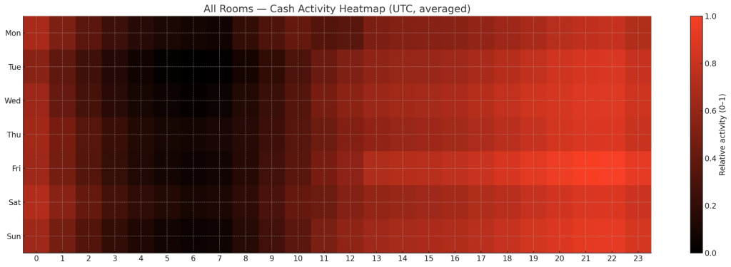 You can see that the rooms’ peak hours fall between approximately 14:00 PM and 00:00 UTC, varying slightly by day of the week. After this, cash traffic drops dramatically, even though it’s only early evening in most US states.