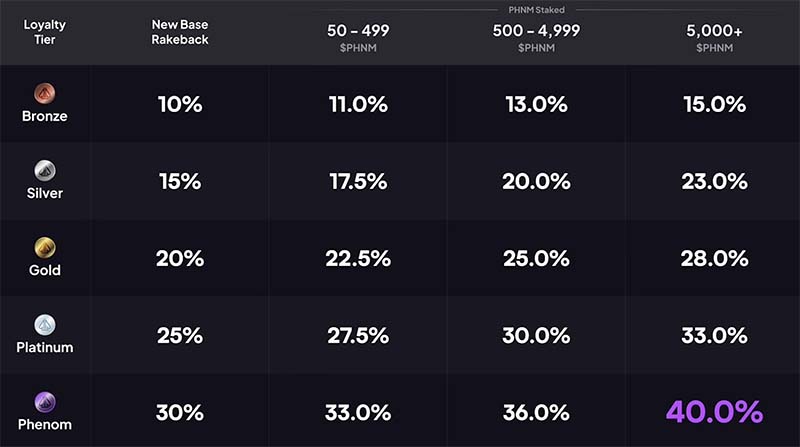 Under the Phenom Poker loyalty program, players receive up to 30% rakeback in USDT weekly, plus an additional up to 10% depending on the amount of PHNM staked.